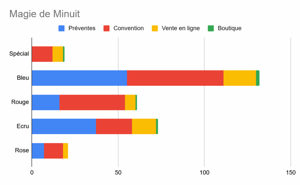 - Un petit coup d’oeil aux couleurs montrent étonnamment que la poche Rouge de Magie de Minuit a plus de succès en convention qu’à l’achat en ligne. La pochette Bleue est la grande favorite.