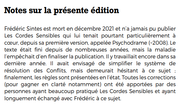 Mais pour nous, ce projet est avant tout une question de transmission. Frédéric Sintes faisait partie de ces personnes qui ont façonné la scène rôliste alternative francophone. Et ce serait une perte immense si ses créations disparaissaient avec lui.